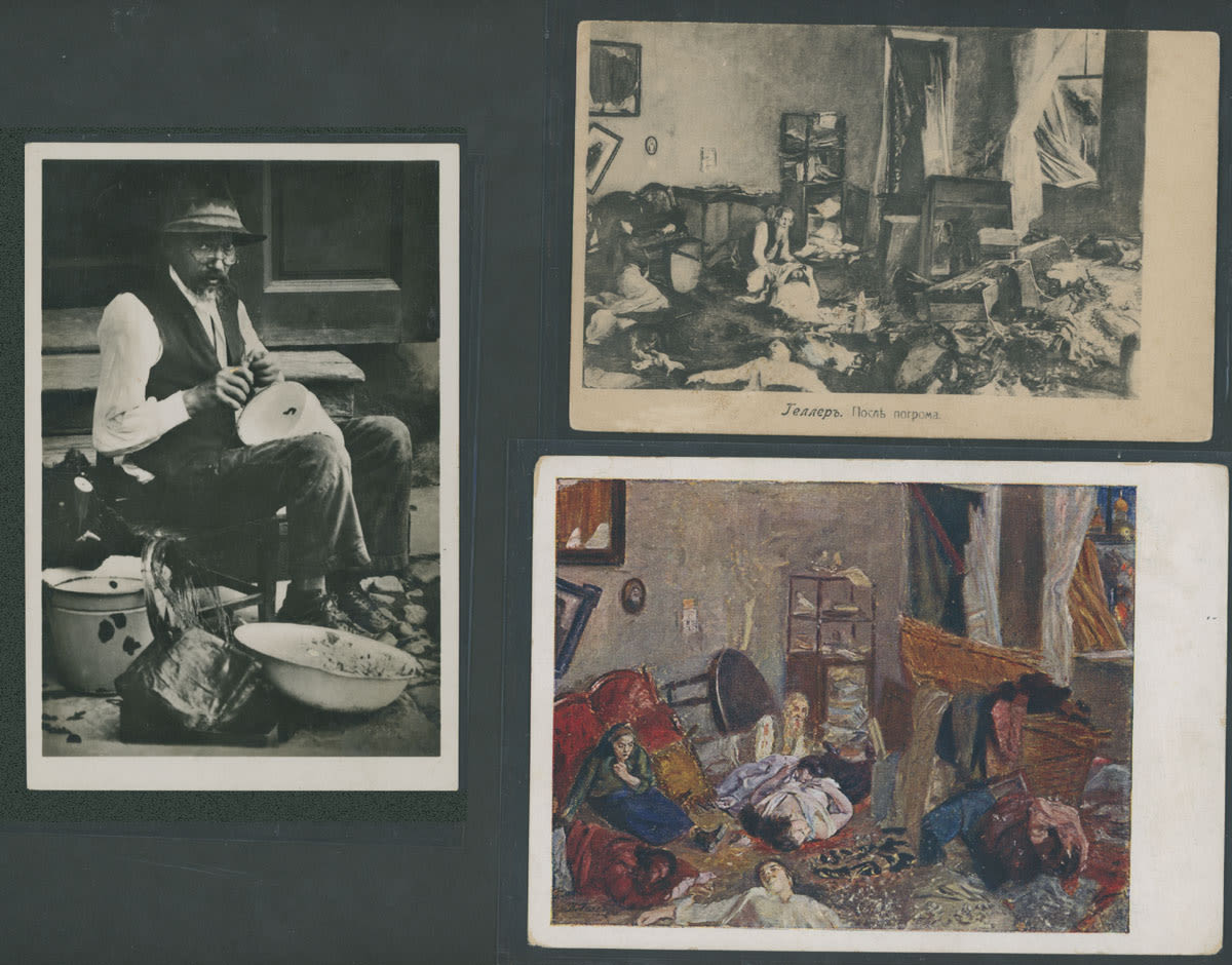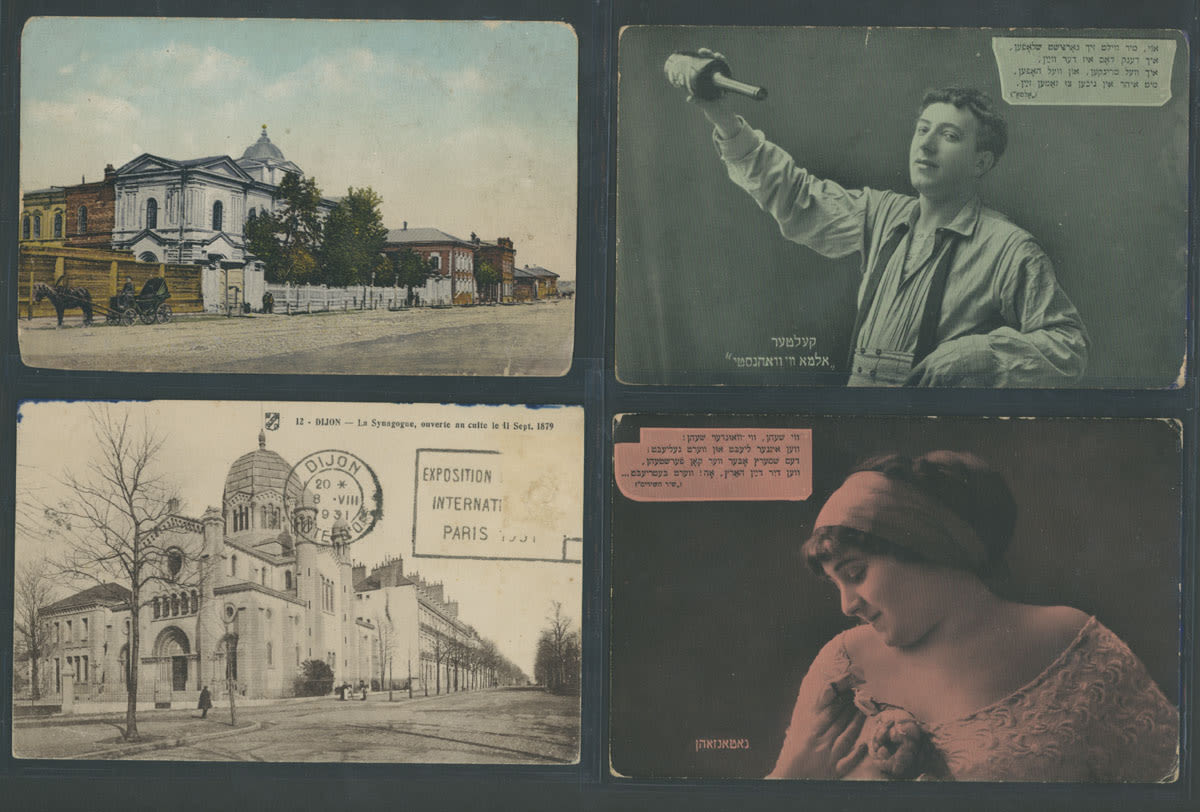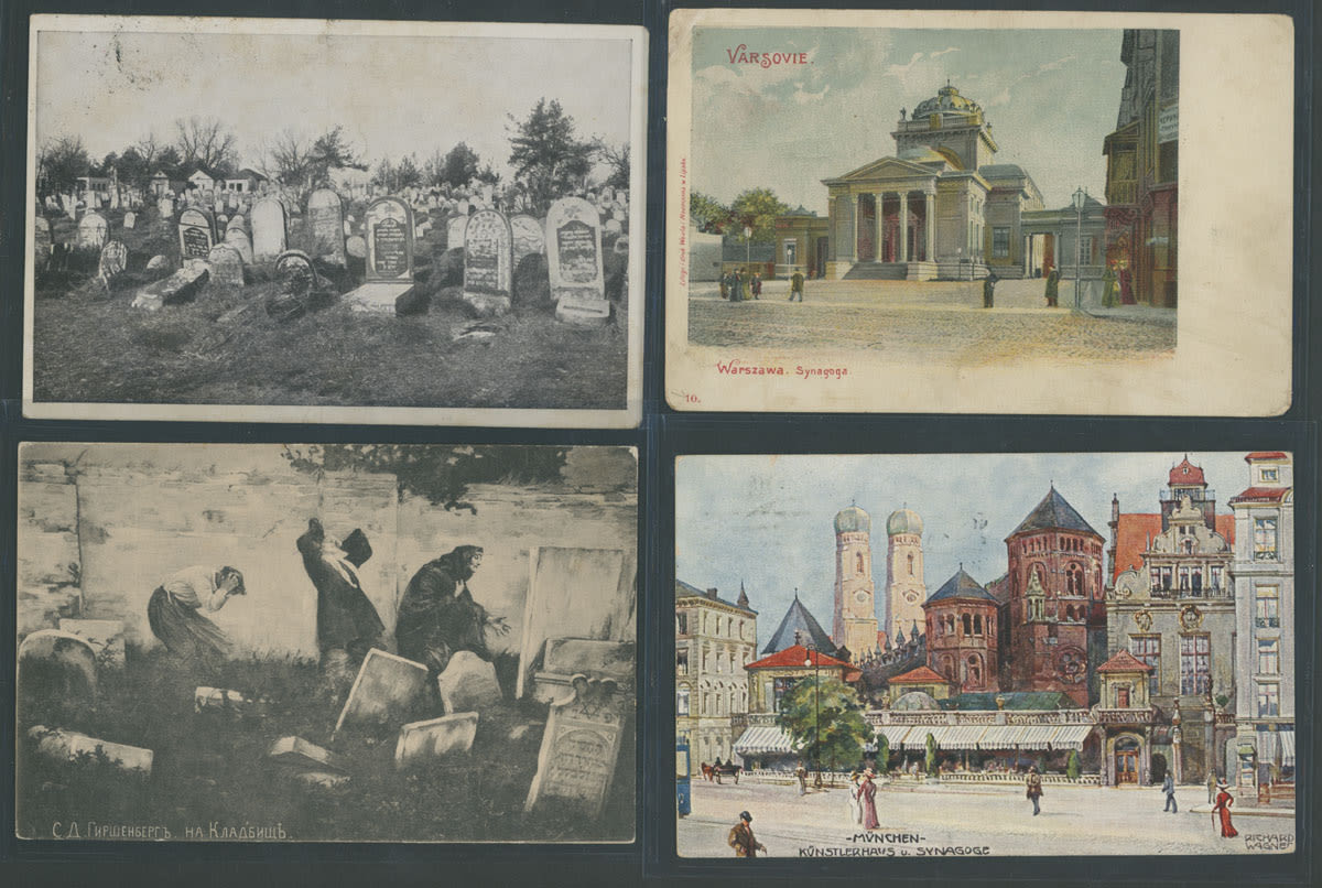BALANCE OF JUDAICA POSTCARDS CONSIGNMENT: 1900-20’s, 11 black-and-white or color PPC, including three Jewish types – Young Man, Young Woman and Jewish Tinkerer, four of Synagogue views – Dijon, Irkutsk, Munich and Warsaw, two showing Jewish Cemetries and two similar cards representing artwork of Petr Geller ”After the Pogrom of 1905”, minor flaws mentioned, four used, seven unused, F/VF, Est. $200-$240