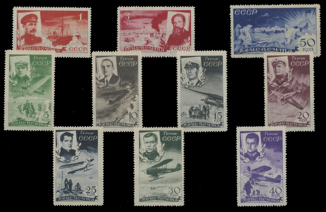 1935, Chelyuskin Rescue, 1k-50k, complete set of ten, nicely centered with fresh colors and intact perforation, full OG, NH, VF, C.v. $2,058, Est. $1,500-$1,800 , Scott #C58-67
