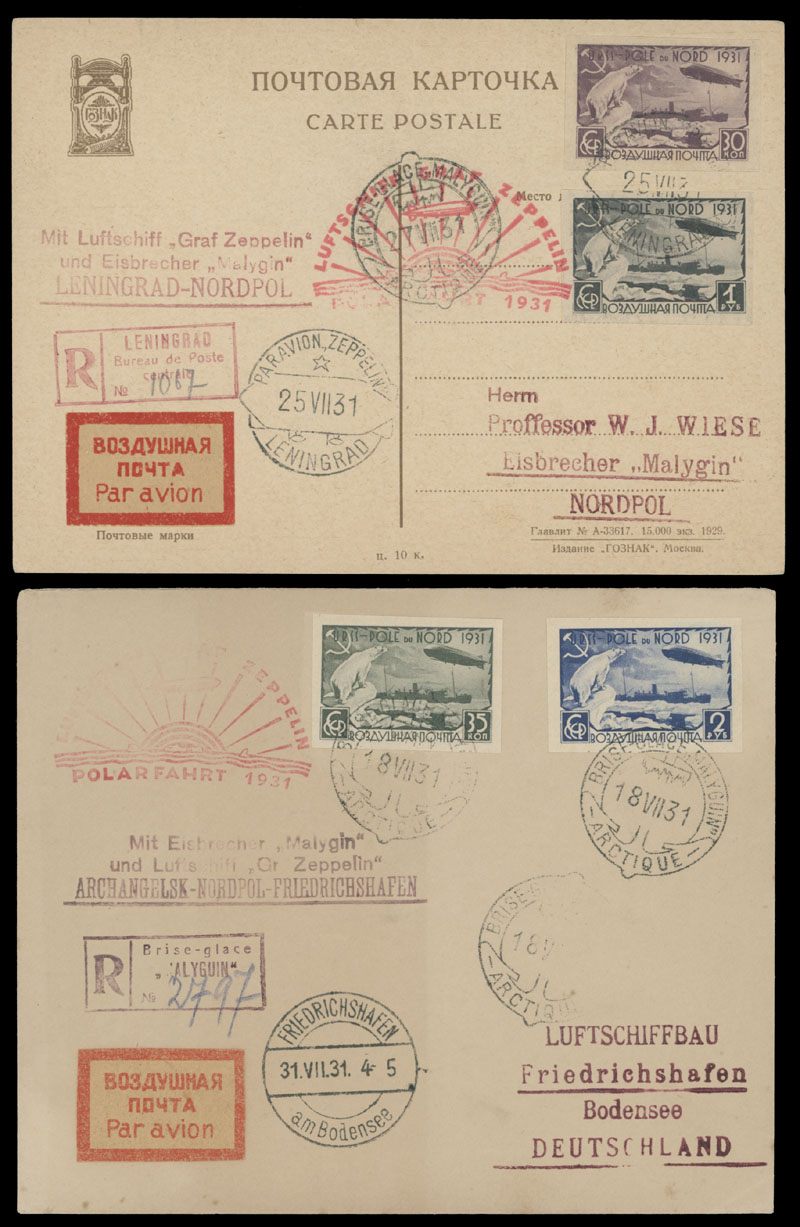 1931 (July 24-31), North Pole Flight card and cover, franked by Zeppelin and Ice-Breaker ”Malygin” imperforate set of four (30k +1r and 35k and 2r), tied by special date stamps, each one with red flight cachet, Leningrad ”25.VII.31” or Friedrichshafen ”31.VII.31” arrival markings, VF, Sieger #120Ab, 120Ba,, Est. $200-$250, Scott #C26-29