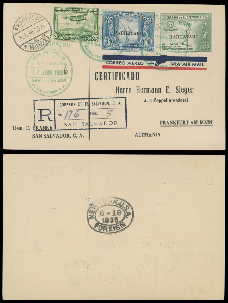 1936 (June 19-26), Airship Hindenburg 3rd North America Return Flight registered postcard to Germany, franked by three stamps, including two air post values, tied by special ”17.JUN.1936” postmark in green, New York ”6-19. 1936” connection on reverse and Frankfurt ”26.6.36” receiver on front, mostly VF, Sieger #419, C.v. €750, Est. $400-$500, Scott #547, C12, C44