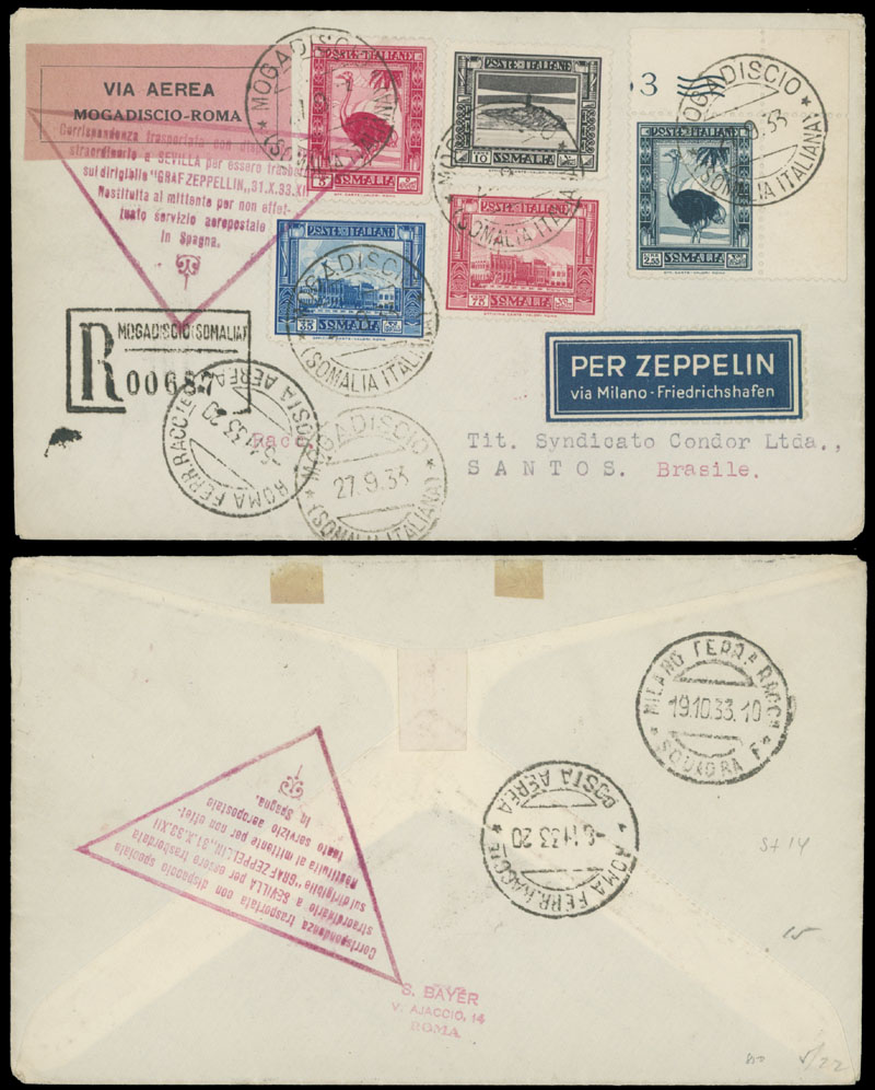 1933 (October 31), registered cover from Mogadishu expected to be sent by Zeppelin Chicago Return Flight on shoulder Seville – Friedrichshafen, franked by five values, including Ostrich 2.55L and 5L, both perf 12 (C.v. $800 and $400 respectively), tied by ”27.9.33” ds, ”PER ZEPPELIN” label in blue and red triangle cachet in Italian ”Returned to sender due of no Air Post Service in Spain” on front and reverse, Milan transit and Rome dropped markings, mostly VF, Est. $300-$350, Scott #140, 145, 147, 151‑52