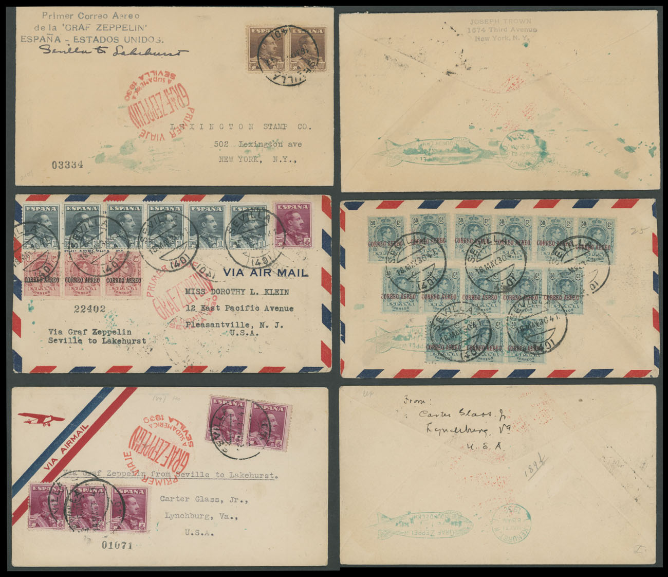 1930 (May 20-31), three 1st SAF covers from Seville to US, franked by 2, 5 or 24 King Alfonso adhesives, tied by ”18.MAY.30” ds, red Spanish confirmation markings, green Lakehurst ”May – 31.1930” machine arrival hs on reverse of each cover, F/VF, Sieger #58B, C.v. €375, Est. $200-$250