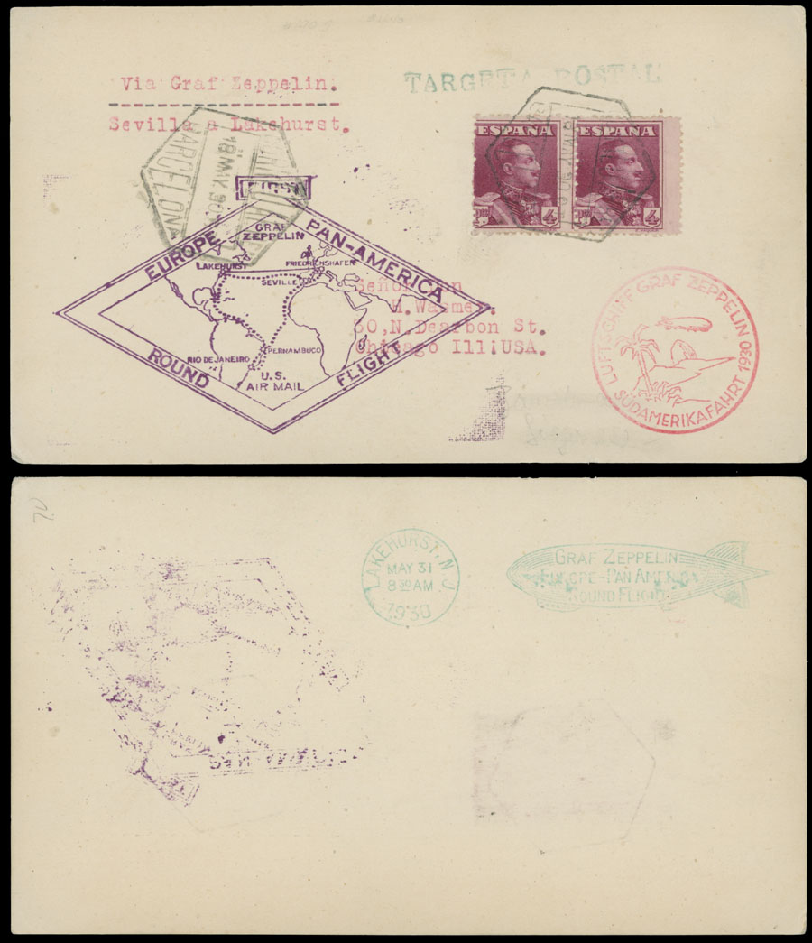 1930 (May 20-31), 1st SAF postcard from Barcelona to US, franked by horizontal pair of 4p lake, tied by hexagon ”18.MAY.30” ds, German (red) and American (type I, violet) confirmation markings (no Spanish one), green Lakehurst ”May – 31.1930” machine arrival hs, VF and scarce, Sieger #58E, C.v. €350, Est. $200-$225, Scott #343