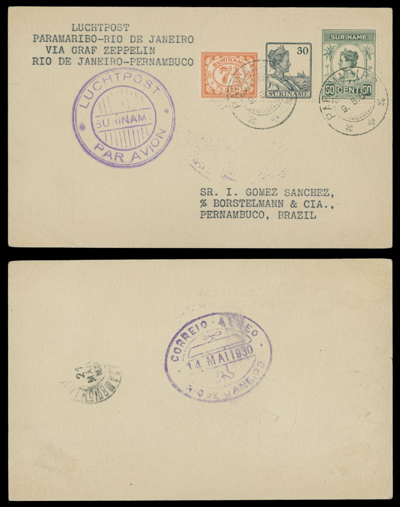 1930 (May 9-21), postcard from Paramaribo, prepared to be sent by 1st SAF on the leg from Rio de Janeiro to Pernambuco on May 25-26, but card arrived to Rio on May 15 and was delivered to Pernambuco on May 21 by air post service, all appropriate markings and arrival ds, mostly VF, Est. $200-$250, Scott #88, 102, 105
