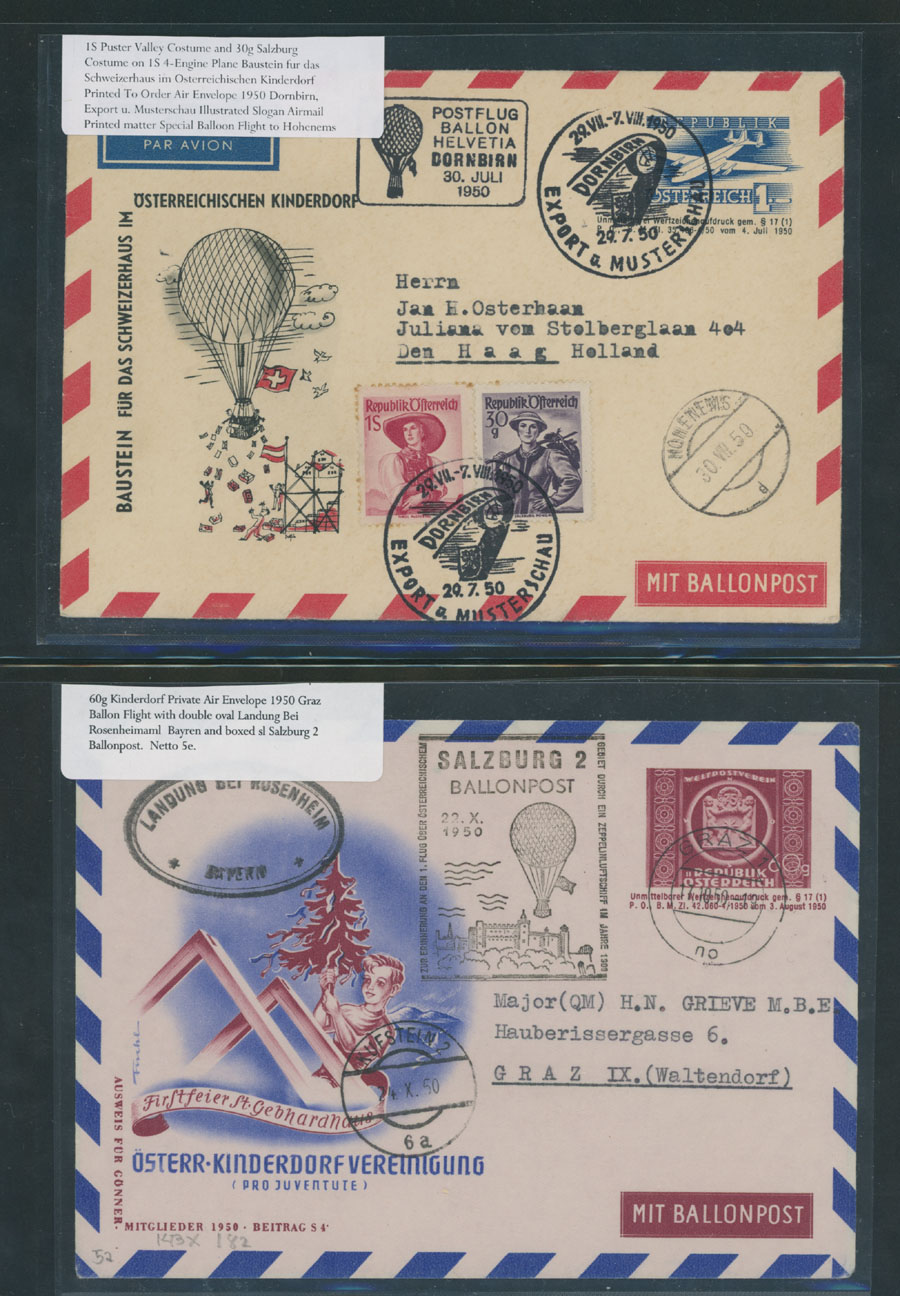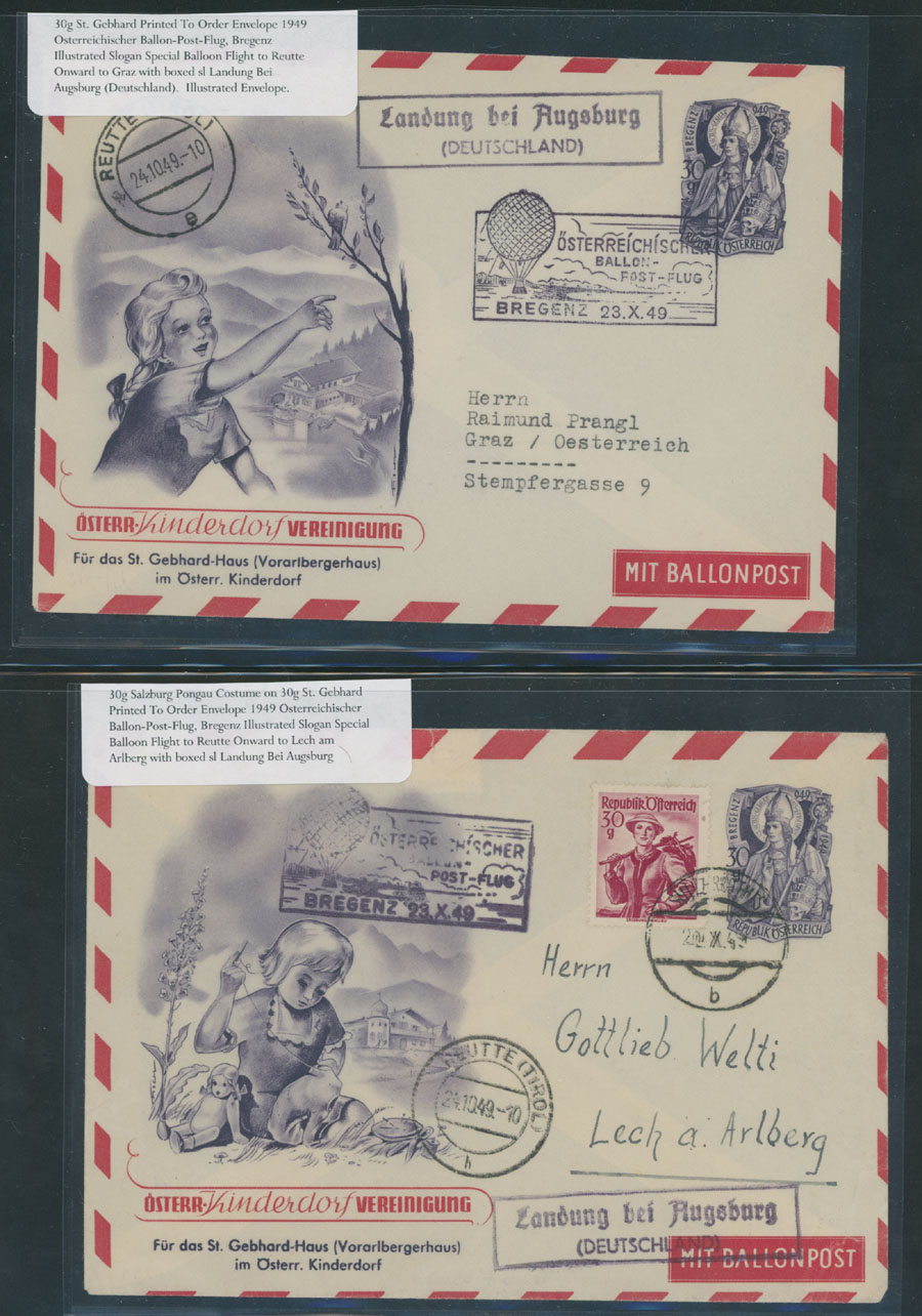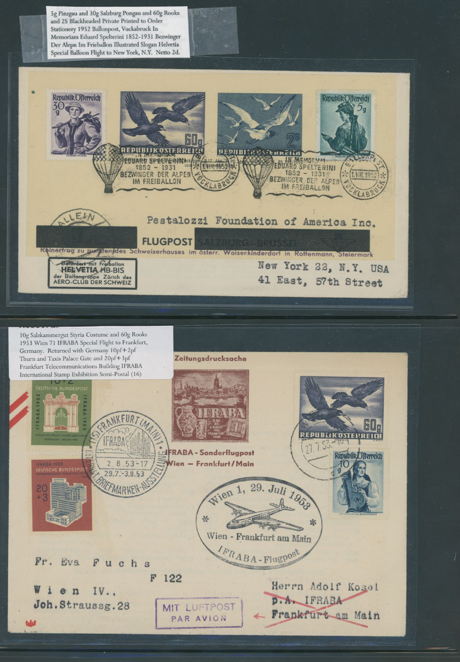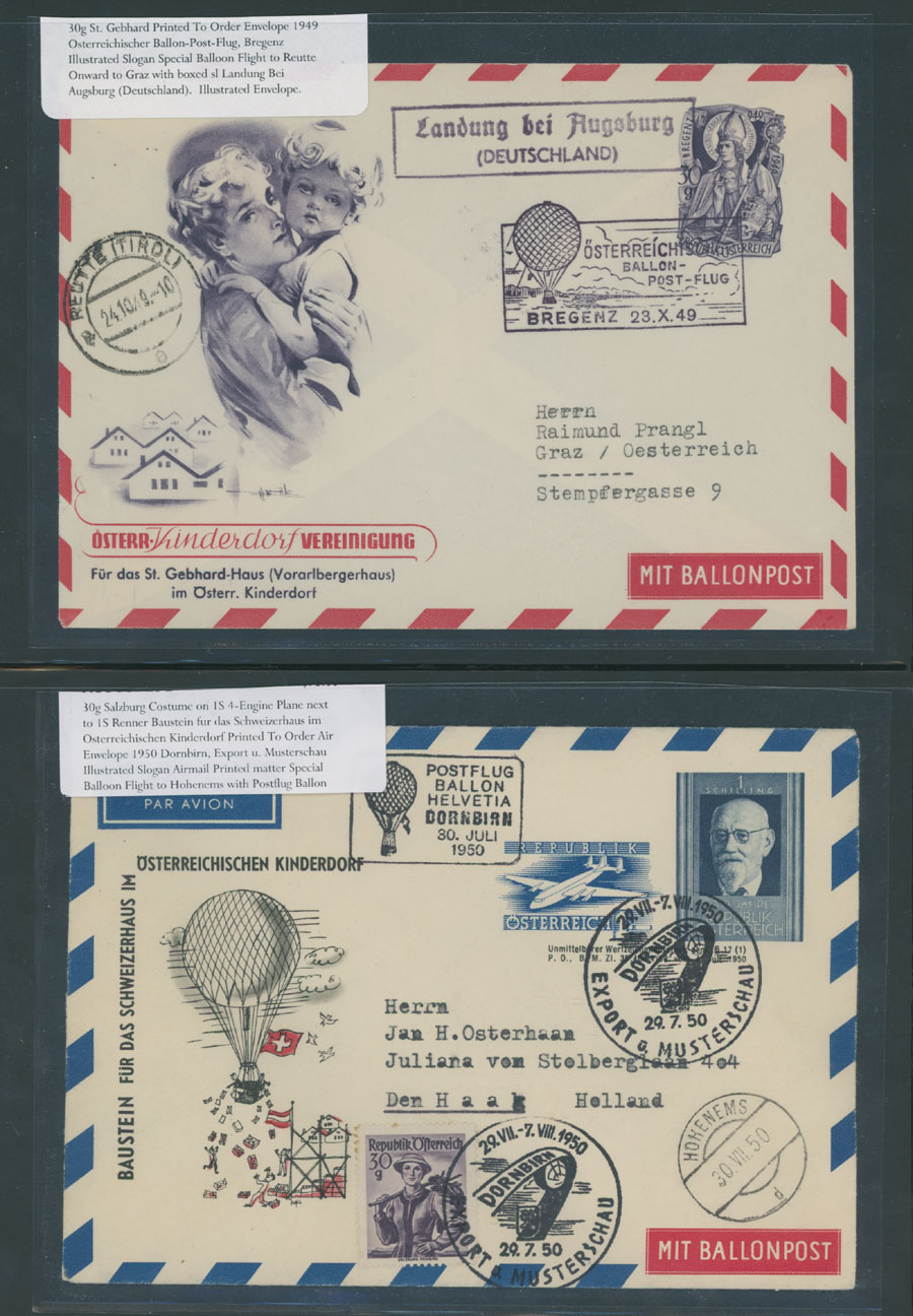 1949-52, eight items, including three different illustrated envelopes of Bregenz Flight of 1949, two different of Austrian Kinderdorf on Postflug Balloon Helvetia Dornbirn, both from 1950, printed to order stationery cover to Pestalozzi Foundation of 1952 and mixed franking (Germany) IFRABA Philatelic Exhibition Flight cover, all are fresh and mostly VF, Est. $150-$200