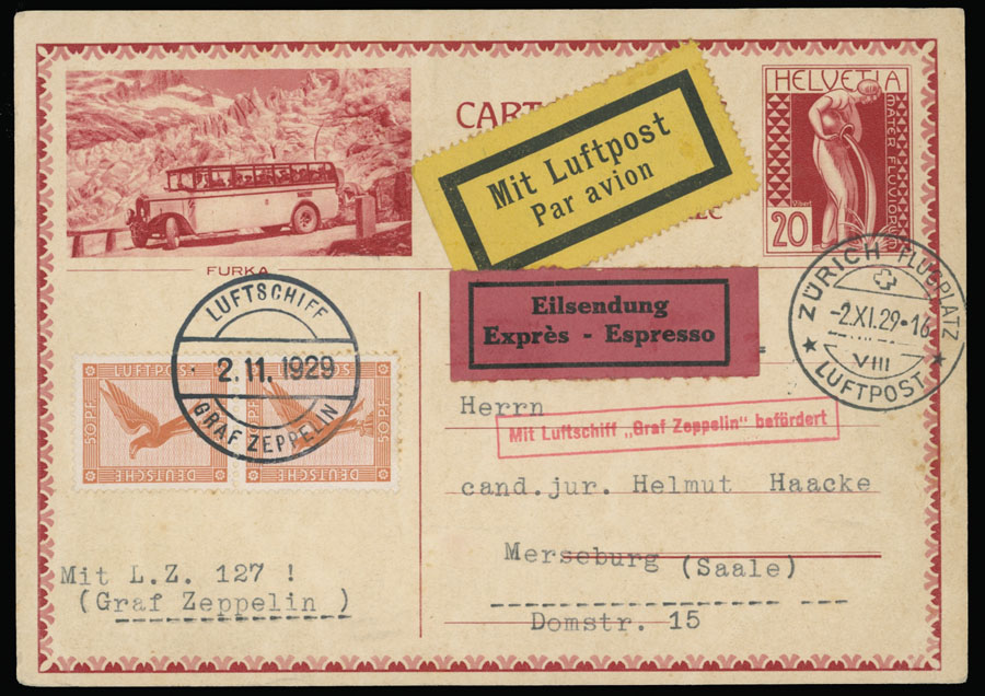 1929 (November 2), Zurich-Dübendorf Flight mixed franking Swiss stationery postcard 20c carmine, tied by Zurich Luftpost ”2.XI.29” date stamp, uprated by pair of German Eagle 50pf orange with the same day on-board cancel, black on red Express and black on yellow Luftpost labels, VF, Est. $100-$120
