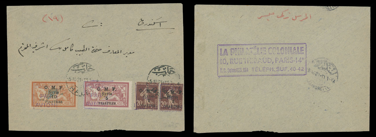 1921 (October 5), four surcharged values – 1p/20c in pair, 5p/1fr and 10p/2fr, used on flown cover from Aleppo to Alexandretta, postmarked on arrival, F/VF and rare, Est. $200-$250, Scott #C4-C6