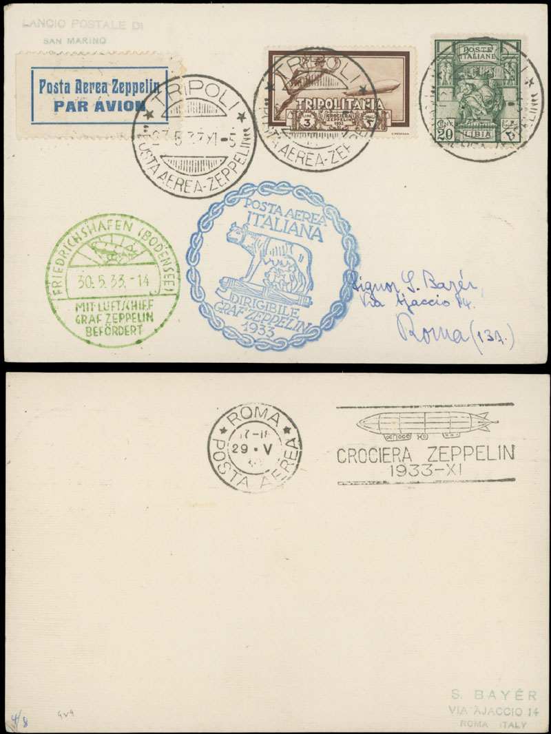1933 (May 29-30), Italy Flight mixed franking postcard from Tripoli, franked by Zeppelin stamp of 3L brown and Libyan Sibyl 20c green, tied by Tripoli ”27.5.33” date stamps, blue confirmation cachet, Rome ”29.V.33” machine connection on reverse, Friedrichshafen ”30.5.33” special drop marking, VF and scarce franking, Sassone C.v. €650 for 3L stamp on correspondence, Est. $200-$250, Scott #C21
