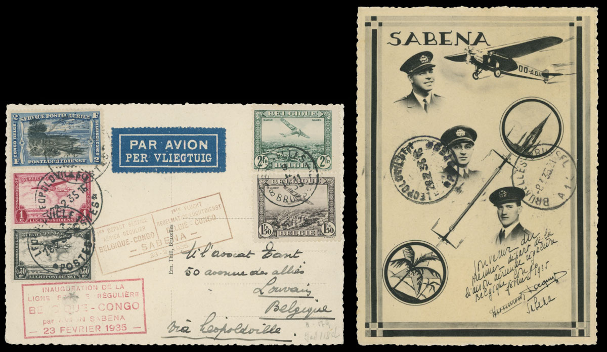 1935 (February 9-23), Inauguration Sabena Round Flight to Leopoldville, postcard with mixed franking of 2 Belgian and 3 Belgian Congo air post values, appropriate confirmation and arrival markings, VF, Est.$120-$150