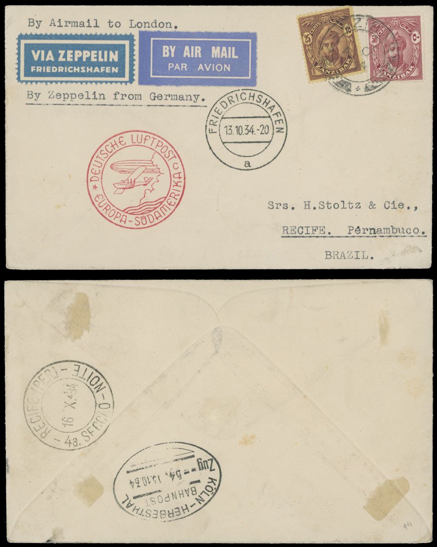 1934 (October 13-16), 10th SAF cover to Brazil, franked by two definitive stamps of 25c and 30c, cancelled by ”4.OC.1934” date stamp, Friedrichshafen transit ”13.10.34” and red letter ”c” flight markings, Pernambuco ”16.X.34” receiver, slight traces of previous mounts, still F/VF and very rare, Sieger #280, C.v. €1,450, Est. $800-$900, Scott #192-93