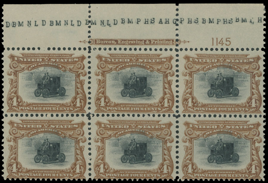 1901, Pan-American Exposition, Electric Automobile, 4c red brown and black, top sheet margin plate No.1145 block of six, much better centered that usually comes, full OG, NH, almost VF, C.v. $2,750, Est. $1,200-$1,500 , Scott #296