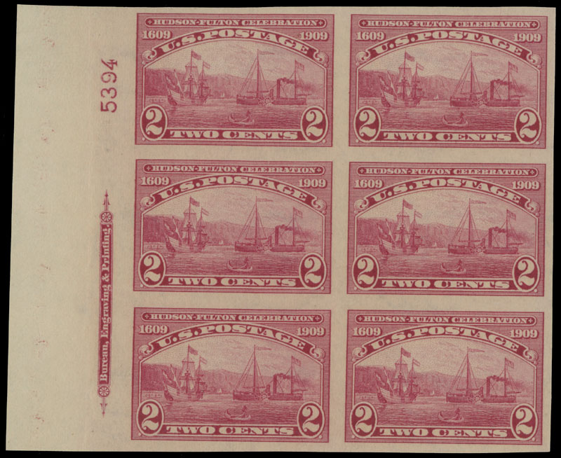 1909, Hudson-Fulton Celebration, 2c carmine, left sheet margin imperforate plate No.5394 block of six (2×3), minor usual waves, full OG, NH, VF, C.v. $375, Est. $150-$180 , Scott #373