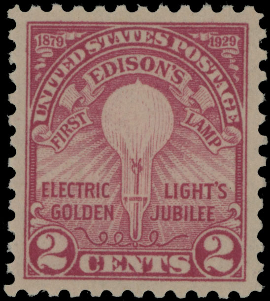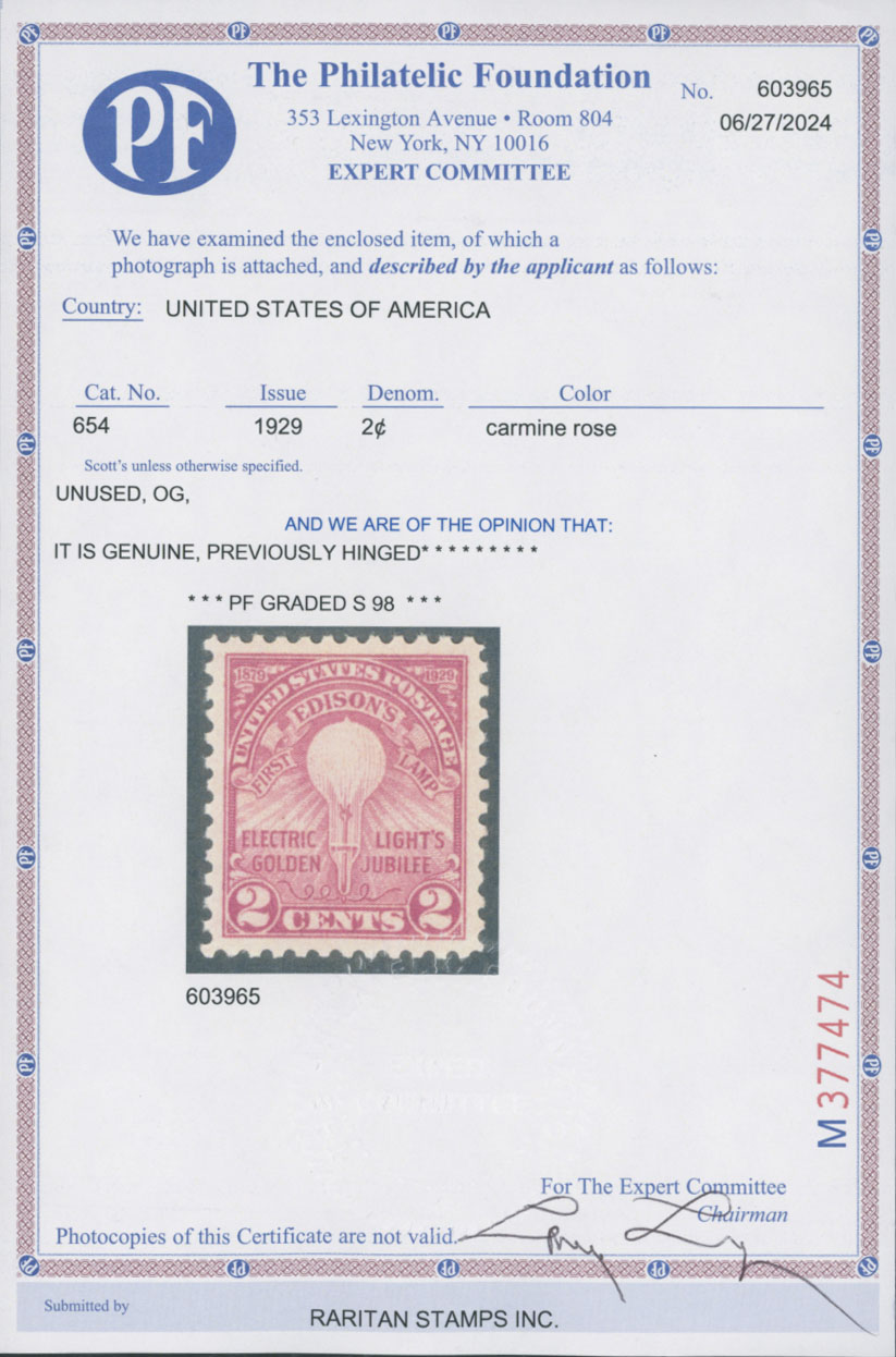1929, Edison’s First Lamp, 2c carmine, full OG, previously hinged, SUP-98, PF certificate, Est. $80-$100 , Scott #654