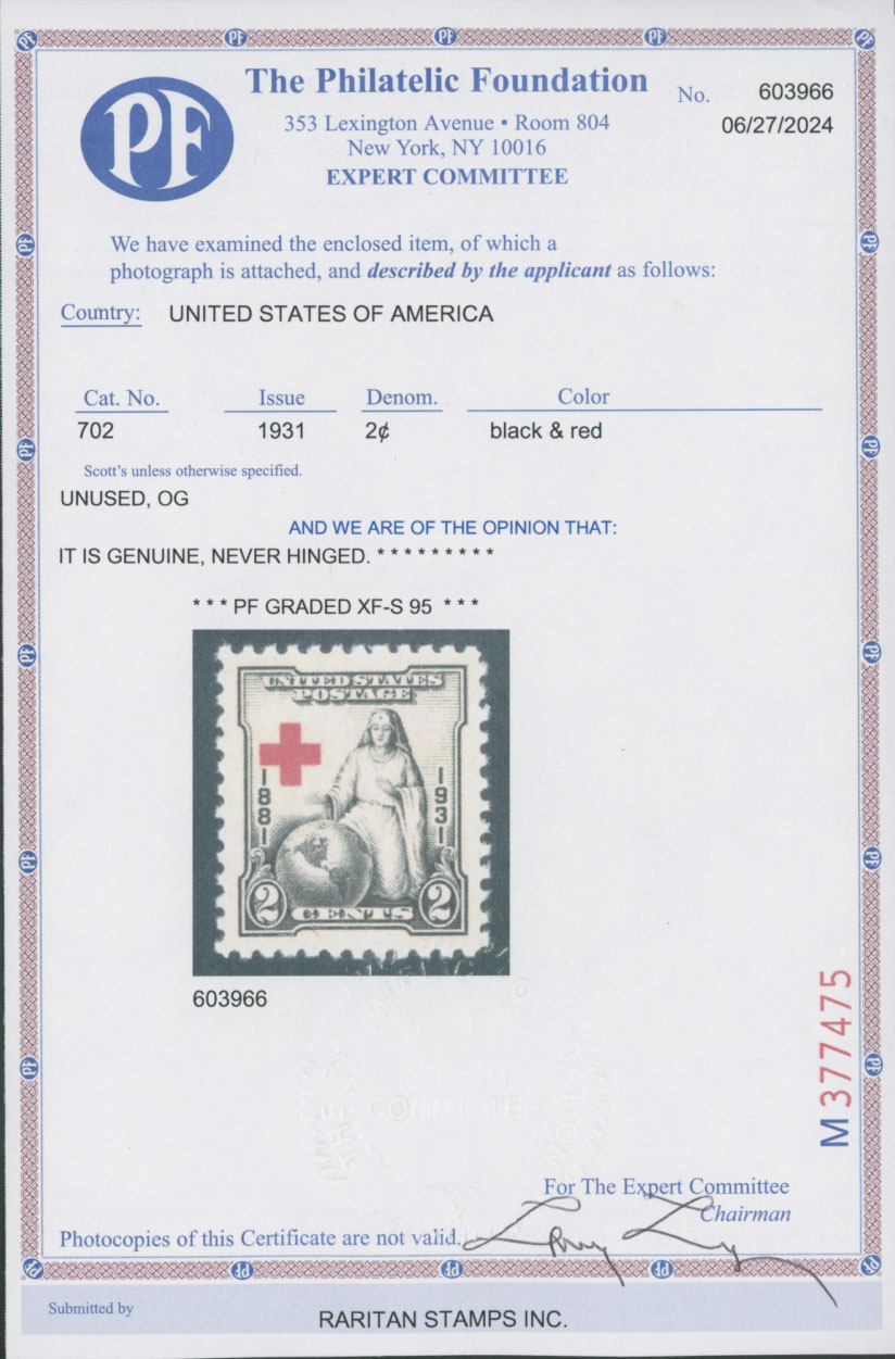 1931, Red Cross, 2c black and red, full OG, NH, XF- SUP95, PF certificate, Est. $100-$120 , Scott #702