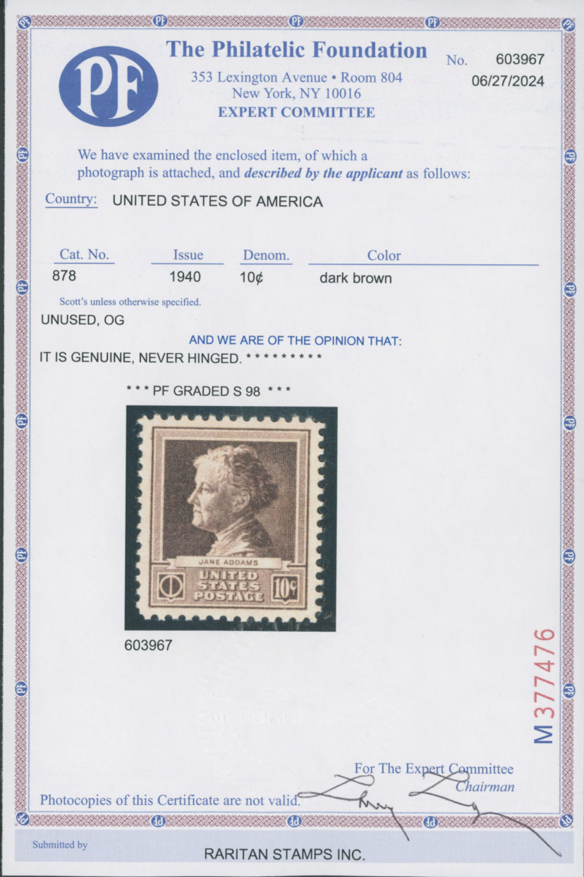 1939, Jane Addams, Sociologist and Philosopher, 10c brown, full OG, NH, SUP-98. PF certificate, Est. $100-$120 , Scott #878