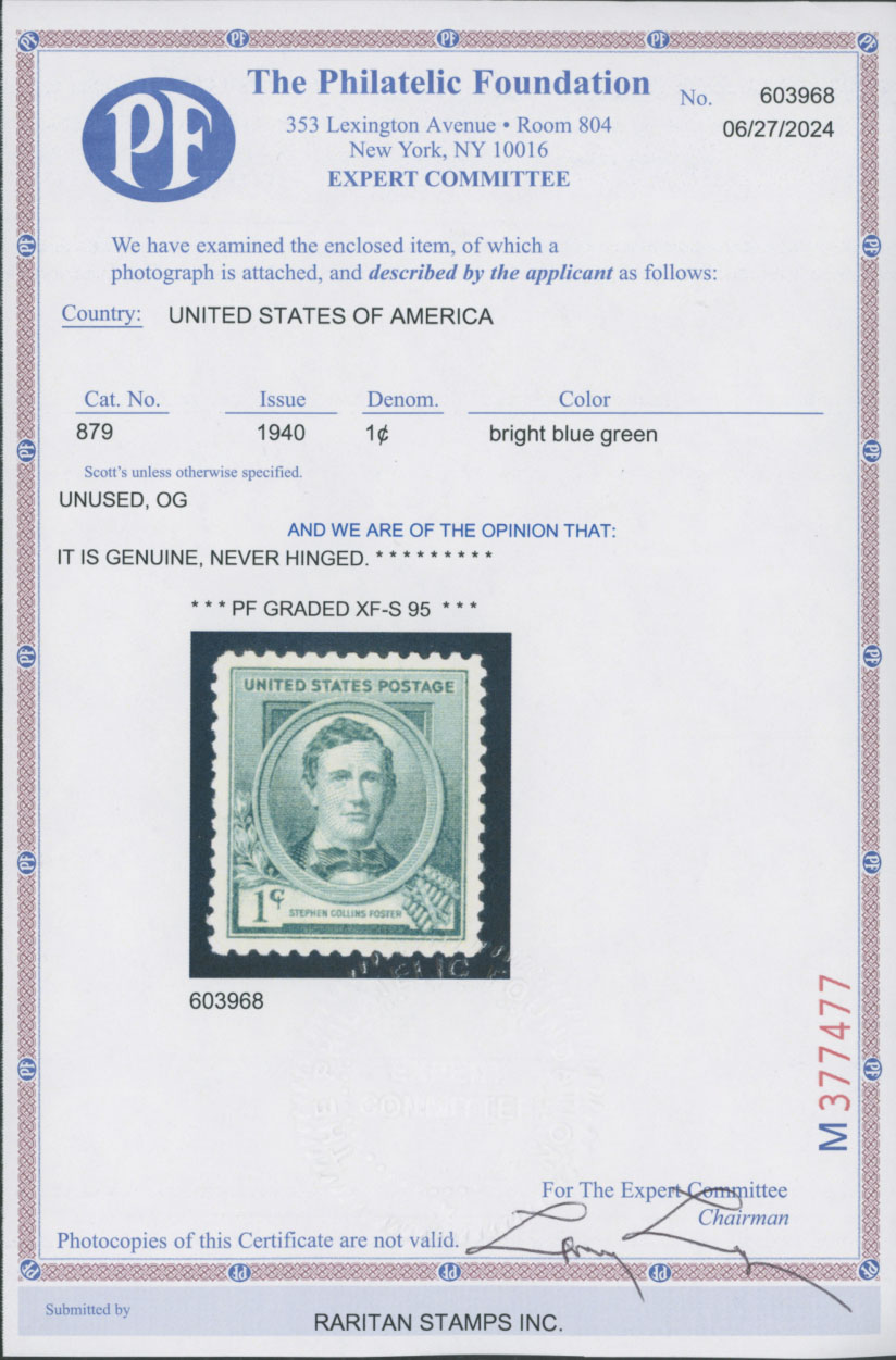 1939, Stephen C. Foster, Composer, 1c green, full OG, NH, XF-SUP95, PF certificate, Est. $80-$100 , Scott #879