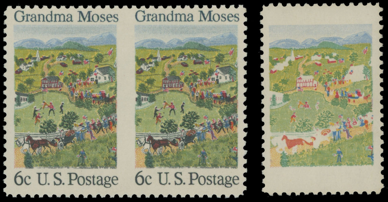 1969, Folklore issue, 6c multicolored, horizontal pair imperforate between stamps, and a single with black and Prussian green engraved color omitted, the last one with somewhat gum disturbed, otherwise fresh, full OG, NH, VF, C.v. $540, Est. $200-$250, Scott #1370a, b