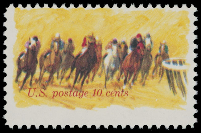 1974, Horses Rounding Turn, 10c yellow and multi, a single with blue ”Horse Racing” omitted, red color (US Postage 10 cents) shifted to the top, full OG, NH, VF, C.v. $500, Est. $200-$250 , Scott #1528a