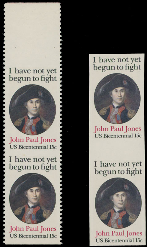 1979, John Paul Jones, 15c multicolored, top sheet margin vertical pair imperforate horizontally with vertical perforation 11, and imperforate proof of complete design in vertical gutter pair, both with full OG, NH, VF, C.v. $715, Est. $300-$350 , Scott #1789Ad, Pg