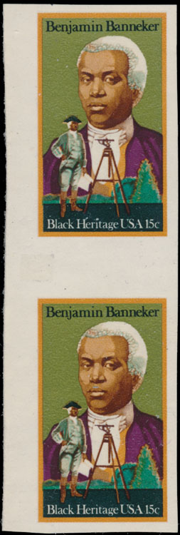 1980, Benjamin Banneker, 15c multicolored, left sheet margin vertical imperforate pair with gutter in the middle, colors perfectly aligned, full OG, NH, VF and rare item from a printer’s waste, Est. $200-$250suggested retail $300 , Scott #1804 var