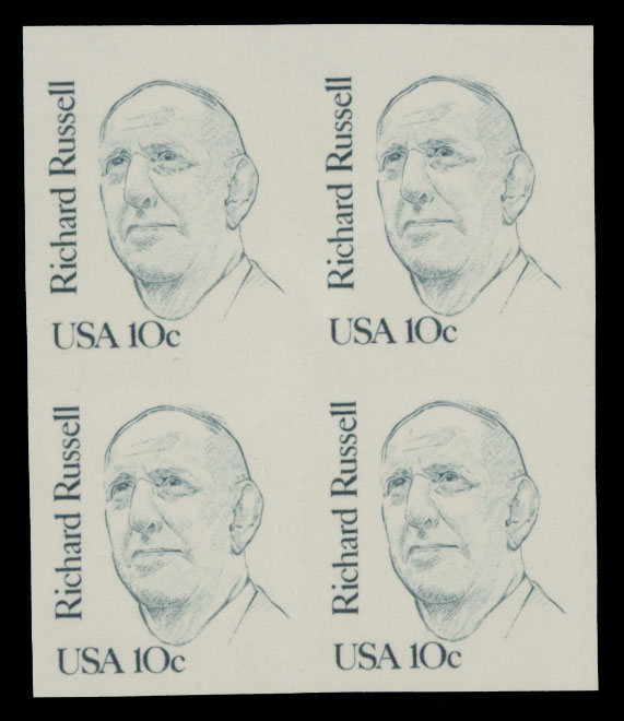 1984, Richard Russell, 10c greenish blue, top right corner imperforate block of four, full OG, NH, VF, reportedly this error came from a printer’s waste, Errors C.v. $300 as two pairs, Est. $200-$250 , Scott #1853 imp