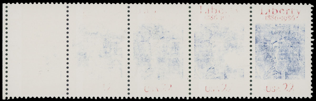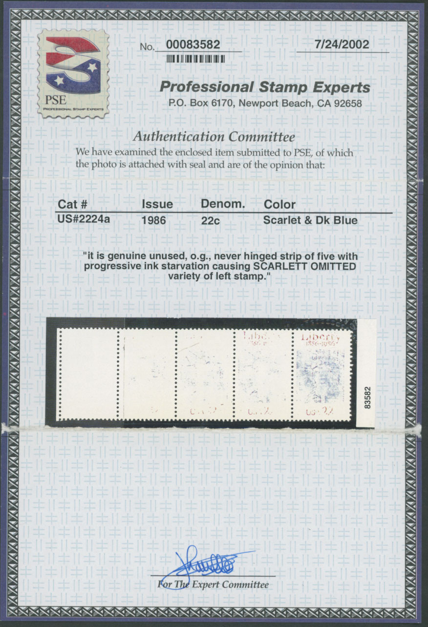 1986, Statue of Liberty, 22c scarlet and dark blue, horizontal transition strip of five, left stamp has completely omitted scarlet color and presented just splashes of blue, while others represented both colors in various degree, full OG, NH, VF and very rare, PSE certificate, priced with ”-” in the Cat., Est. $800-$900, Scott #2224a