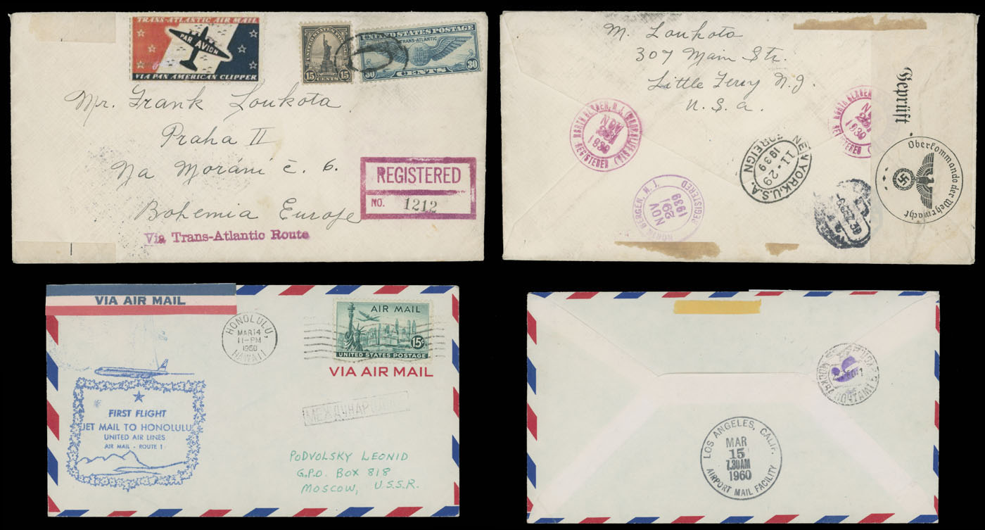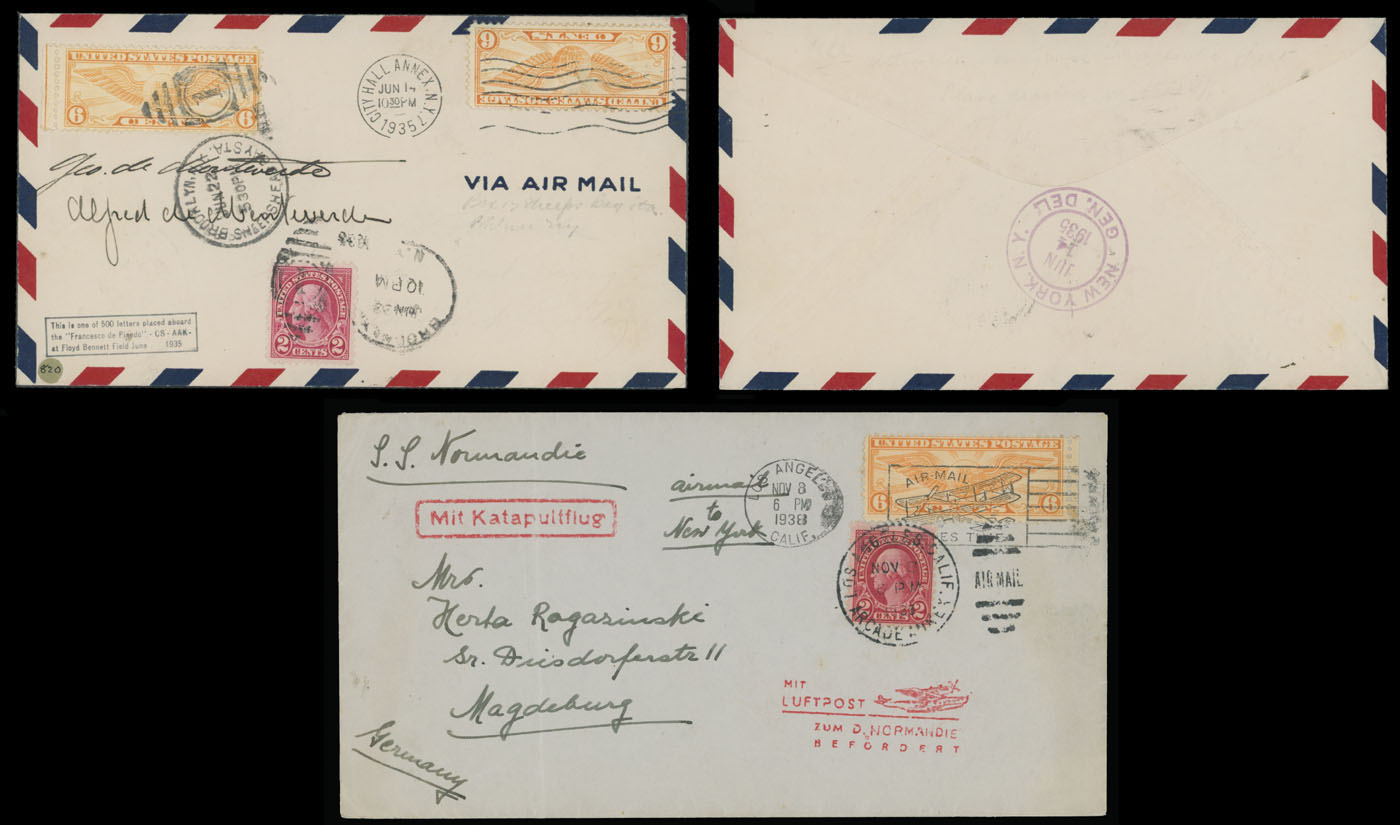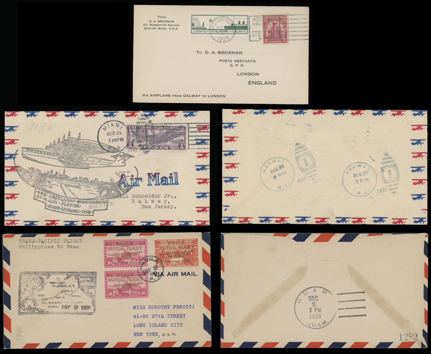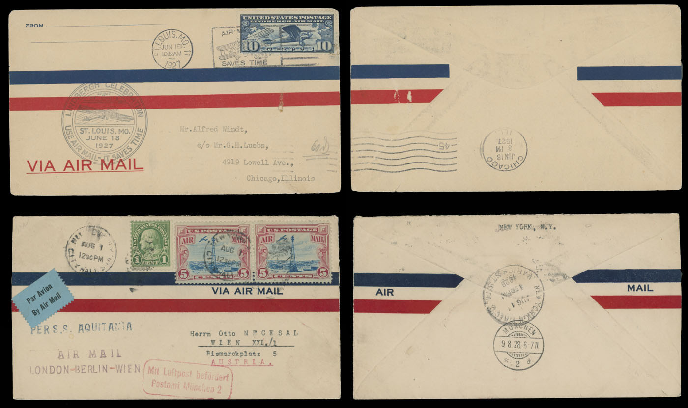 1927-82, 12 items, including ”Lindbergh Celebration” St. Louis-Chicago, cover delivered by S.S. Aquitania for Flight London-Munich- Berlin-Vienna of 1928, cover from Boston with portion delivery from Galway to London of 1929 and etc., mainly fresh and flawless, F/VF, Est. $200-$250