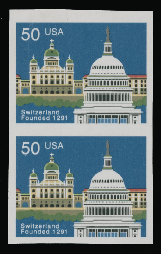 1991, 700th Anniversary of Switzerland, 50c multicolored, vertical imperforate pair, full OG, NH, VF and scarce item, considered to be from a printer’s waste, Errors Cat. $200, Est. $150-$180 , Scott #2532 imp