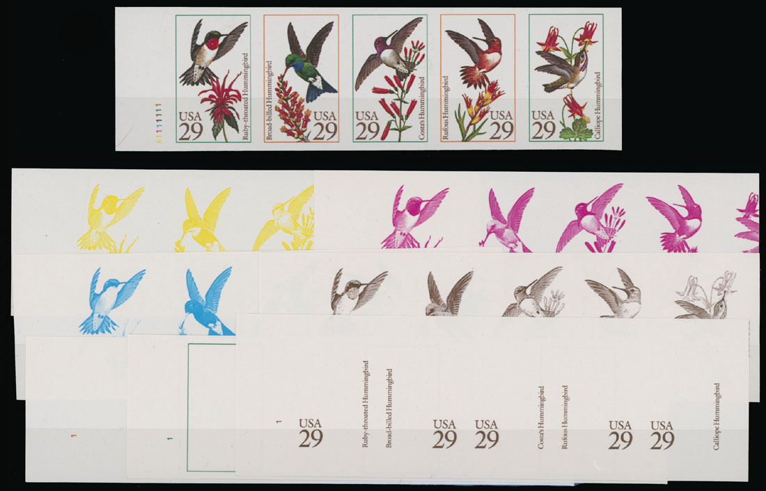 1992, Hummingbirds 29c in se-tenant strip of five, 8 imperforate stage proof strips in yellow, magenta, blue, brown (birds), brown (USA and 29c), green and orange frames and complete design, some usual miscuts, still full OG, NH, VF and rare assemblage, C.v. $3,600, Est. $1500-$1,800, Scott #2646a Pb‑i