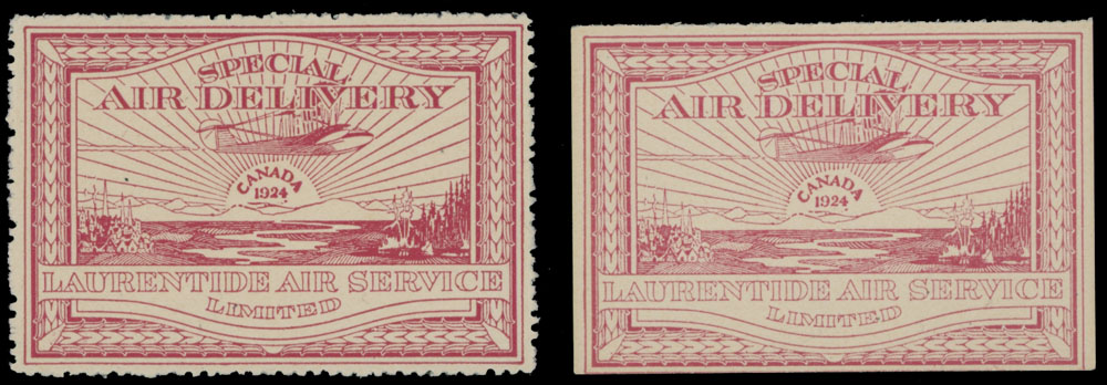 1924, Laurentide Air Service with added ”CANADA 1924”, (25c) red, two single stamps, perforated or rouletted at top, full OG, NH (rouletted) or LH, VF, Unitrade C.v. CAD $450, Est. $150-$180 , Scott #CL3-4