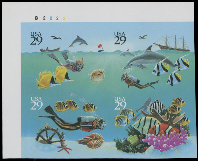 1994, Wonders of the Sea, 29c x4 multicolored, top left corner sheet margin plate No. B2222 imperforate se- tenant block of four, full OG, NH, VF, Errors C.v. $500, Est. $250-$300 , Scott #2866b
