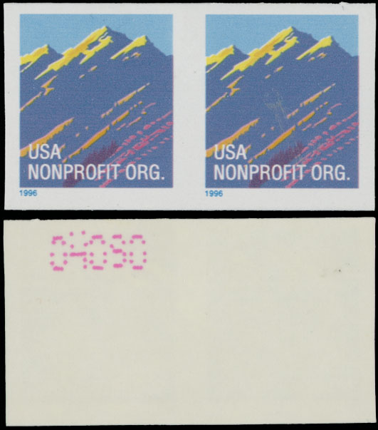 1996, Mountain nonprofit org. (5c) multicolored, horizontal imperforated pair of coil stamps with control No.04090 on reverse, full OG, NH, VF, C.v. $250, Est. $120-$150 , Scott #2904c