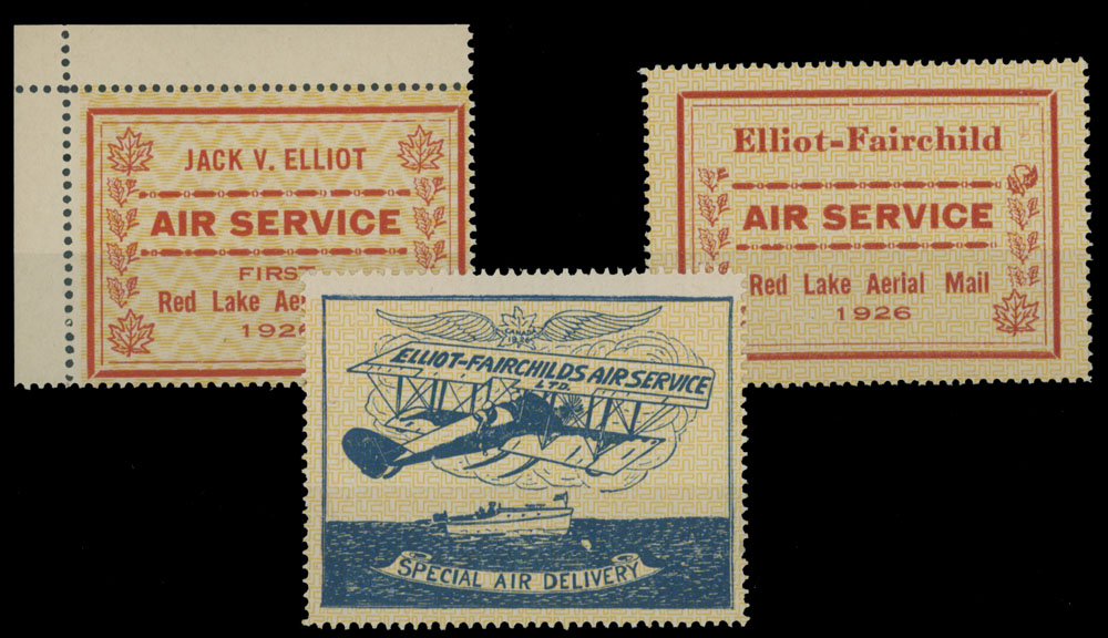 1926, Jack V. Elliot (25c ) red on yellow zigzag lines background, Elliot-Fairchild Air Service, (25c) red and (25) blue, both on yellow swastika background, all with full OG, NH, VF, Unitrade C.v. CAD$225, Est. $75-$80 , Scott #CL6, CL8‑9