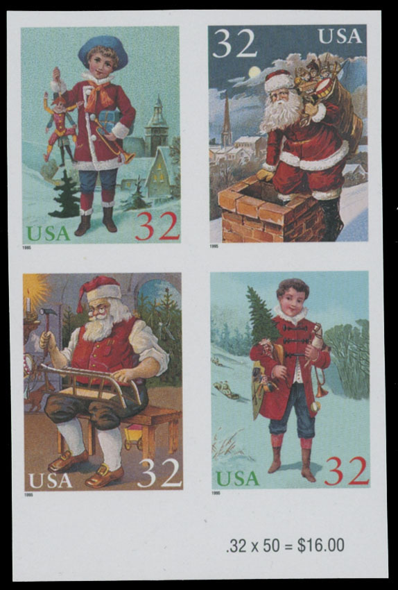 1995, Christmas, Santa and Children, 32c multicolored, bottom sheet margin imperforate se-tenant block of four, imprint on selvage, full OG, NH, VF, C.v. $275, Est. $120-$150 , Scott #3007d