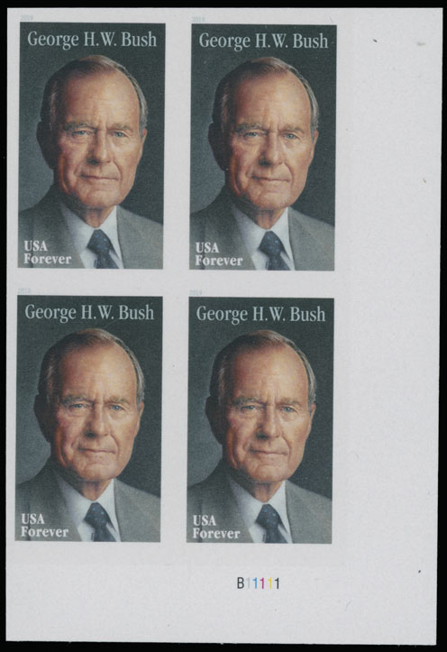 2019, President George H. W. Bush, (55c) Forever multicolored, self-adhesive stamp in bottom right corner sheet margin plate No. B11111 block of four with die cutting omitted, backing paper intact, NH, VF and scarce multiple, C.v. $1,000 as two pairs, Est. $500-$600, Scott #5393a