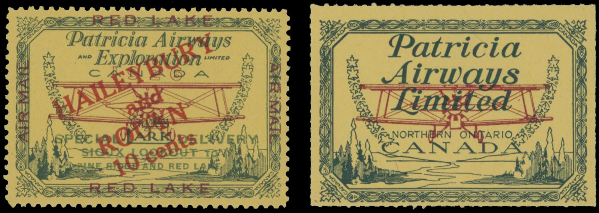 1926-28, Patricia Airways and Exploration Co., Ltd, red surcharge (type A) 10c on (25c) green and red on yellow paper, in addition Patricia Airways Limited, (10c) green and red on yellow paper, rouletted, both with full OG, NH, VF, Unitrade C.v. $285, Est. $100-$120, Scott #CL14, CL43