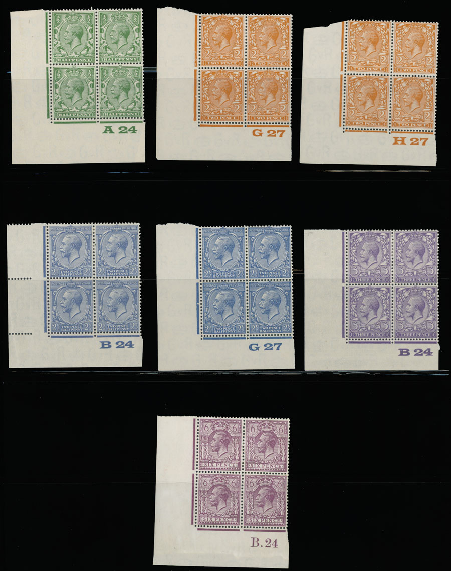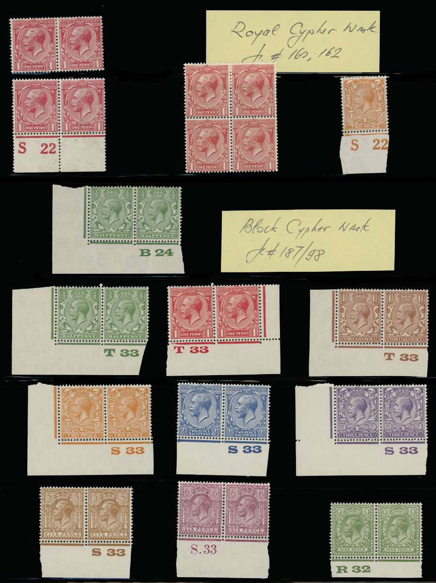 1924, King George V, 1p x3 and 2p with Royal Cypher watermark; and 1p-9p with Block Cypher watermark in 10 bottom sheet or corner sheet plate number horizontal pairs and 7 plate number blocks of four, all with full OG, NH or LH, F/VF and nice specialized multiples unit, Est. $300-$350, Scott #160, 162, 187/98