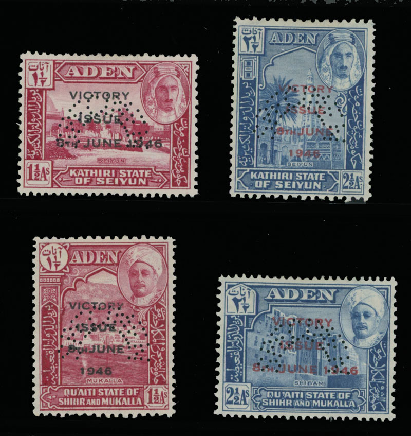 1946, Victory issue of Kathiri and Qu’aiti States, black or red overprints ”Victory issue. 8th June 1946” on 1½a carmine and 2½a deep blue, two sets with perfin ”Specimen”, full OG, LH, VF, SG#12/13, 12/13, C.v. £300, Est. $150-$180