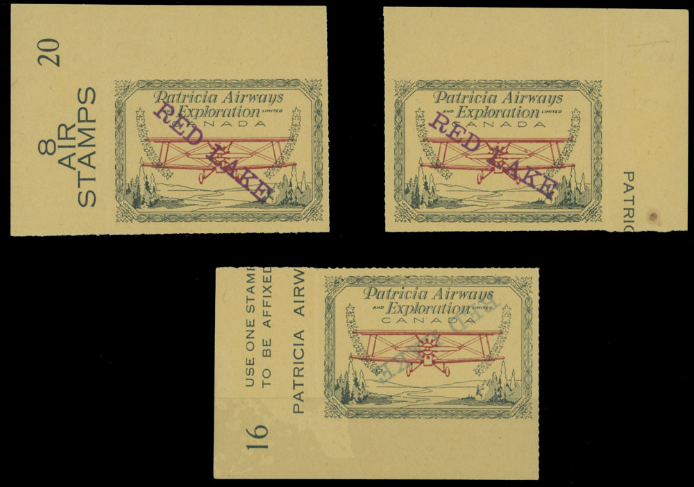 1926-27, Patricia Airways and Exploration Co, Ltd., (5c) green and red on yellow paper, three corner margin values with rouletted perforation, diagonal overprint ”RED LAKE”, two with purple overprints reading downward under different angles, last one has inverted green overprint, full OG, NH (both purple overprints, hinged on margins) or LH, VF, Unitrade C.v. CAD$425, Est. $150-$180, Scott #CL30, var