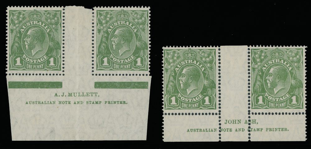 1926, King George V, Kangaroo and Ostrich, 1p sage green on paper with watermark Multiple Small Crown and A, two bottom sheet margin horizontal gutter pairs with A.J. Mullett or J. Ash imprints below the gutter, left stamp of the first pair with ”RA” joined variety, full OG, stamps are NH (hinged on gutters), VF and beautiful positional items, SG #86, d, Est. $150-$180, Scott #67 var