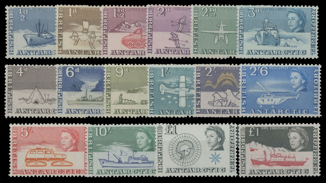 1963-69, Queen Elizabeth II, Dog Sled, Airplanes, Ships, ½p-L1 and HMS Endurance £1 brownish black and red, complete set of 16, full OG, NH, VF, C.v. $332, SG #1/16, C.v. £250, Est. $150-$180 , Scott #1-15, 24