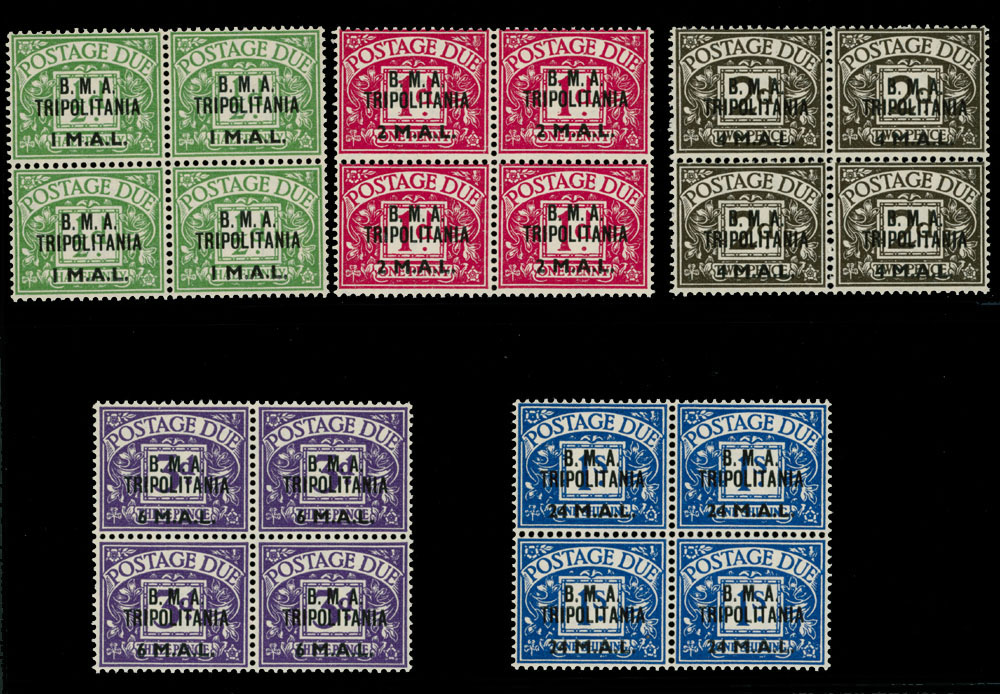 1948, black surcharges ”B.M.A. Tripolitania” and new denominations 1L on ½p – 24L on 1s, complete set of five in blocks of four, full OG, NH, VF, SG #TD1-5, C.v. £200+ +, Est. $150-$180 , Scott #J1-5