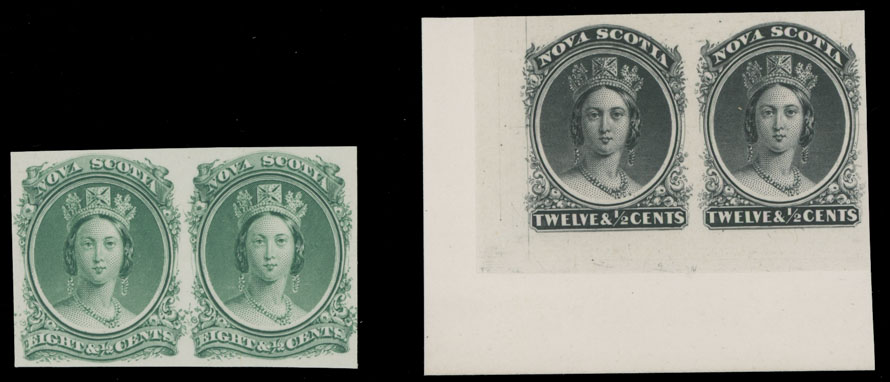 1860-63, Queen Victoria, imperforate plate proofs of 8½c in bluish green and 12½c in black, two horizontal pairs printed on India paper and mounted on cards, no gum as issued, VF, Unitrade #11P, 13P, C.v. CAD$220, Est. $80-$100 , Scott #11, 13