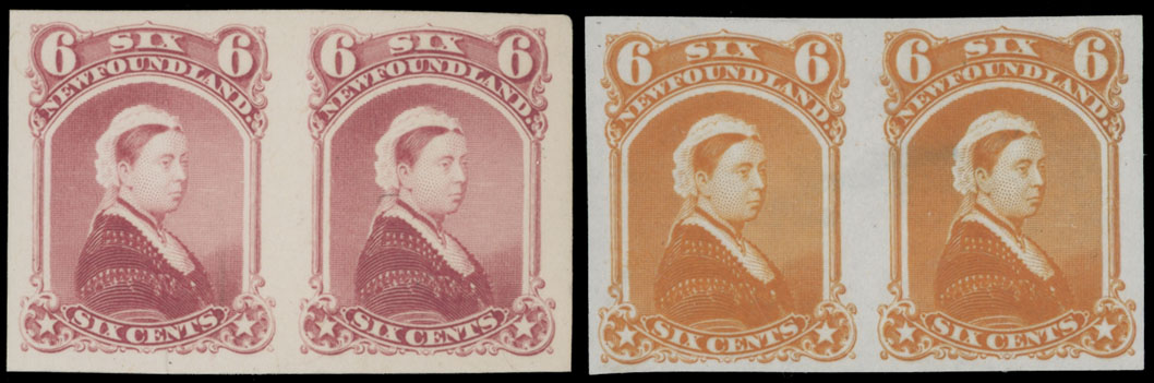 1870, Queen Victoria, imperforate plate proof of 6c in carmine rose trial color proof of 6c in deep orange, horizontal pairs printed on India paper, first one mounted on card, no gum produced, VF, Unitrade #35P, 35TC, C.v. CAD$380++, Est. $120-$150, Scott #35