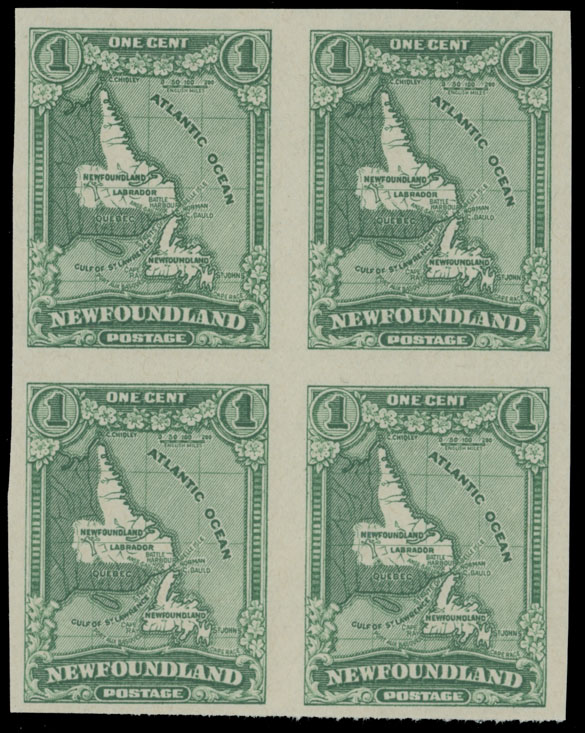 1929-31, Second issue, Map of Newfoundland, 1c green, imperforate block of four, no gum as issued, NH, VF, Unitrade #163c, C.v. CAD$320 as two pairs, Est. $120-$150 , Scott #163 var