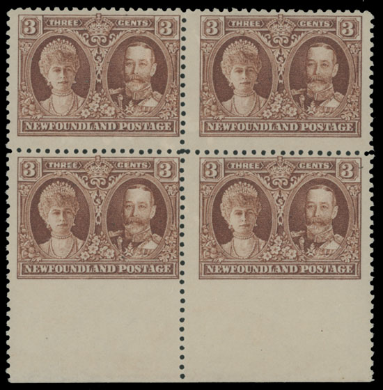 1929-31, Second issue, King George V and Queen Mary, 3c orange brown, bottom sheet margin block of four, imperforate at foot, full OG, NH, fine centering, Unitrade C.v. CAD$800++, Est. $300-$350 , Scott #165 var