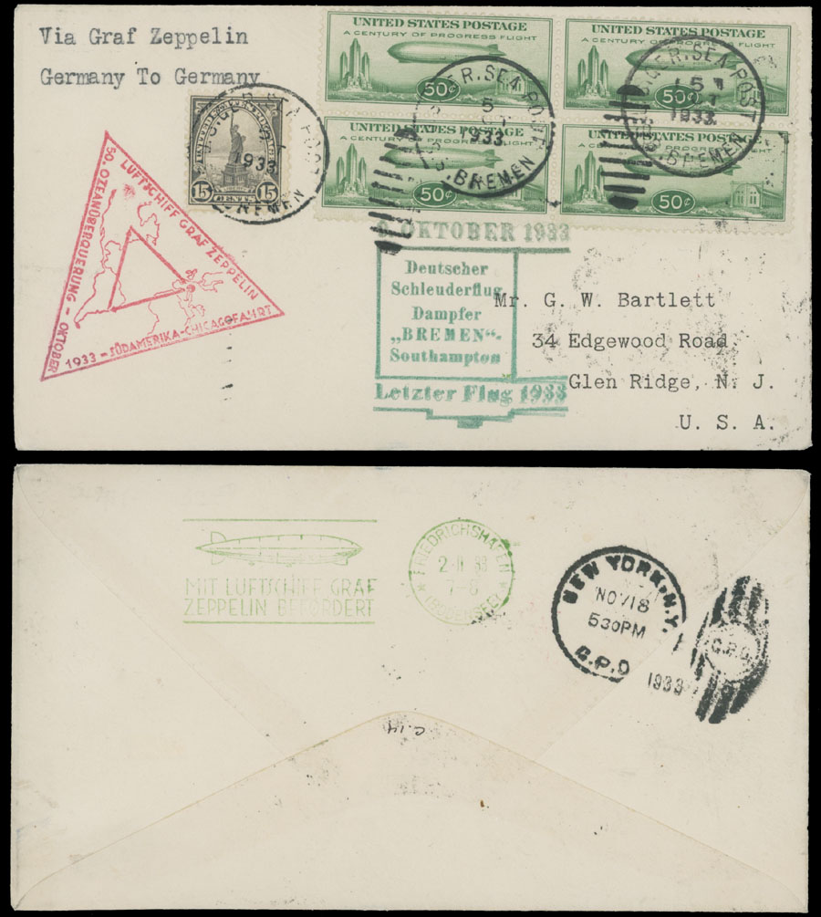 1933 (October 5 – November 2), Century of Progress (Chicago Exposition) Round Flight cover, franked by five stamps, including ”Baby Zeppelin” 50c green in block of four, posted in the mail at Sea Post Office of S.S. Bremen, green Catapult Flight marking, red German Zeppelin Flight cachet, Friedrichshafen arrival ”2.11.33” ds on reverse, VF and not mentioned in the Cat. combination of Catapult and Zeppelin Flights, Est. $600-$700, Scott #C18