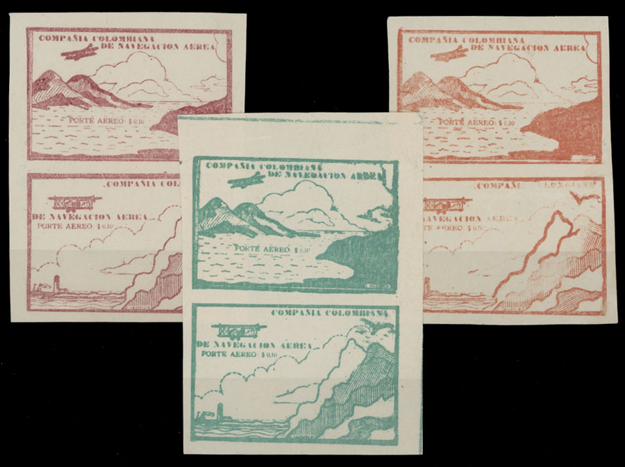 1920, Airplane over Coastline, 10c green, 10c brownish red and 10c vermilion, three vertical se-tenant pairs, the last one with ironed fold on lower stamp, no gum as issued, NH, mostly VF, Champion and Kessler guarantee hs, C.v. $510, Est. $250-$300, Scott #C11A-B, C11C-D, m