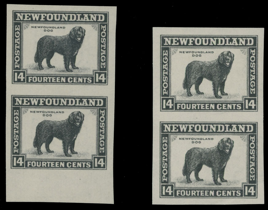 1932-44, Newfoundland Dog, 14c black, two vertical imperforate pairs of Perkins-Bacon and Waterlow printings, full OG, first one is VLH, the last one – NH, VF, Unitrade C.v. CAD$650, Est. $200-$250 , Scott #194a, 261a