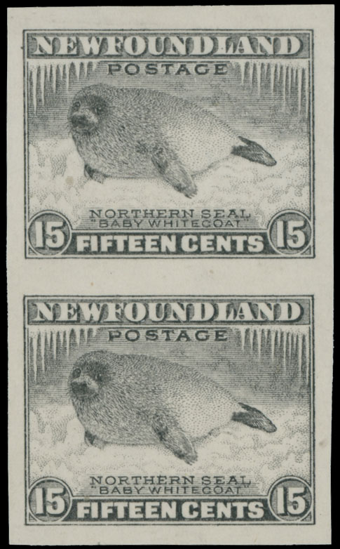 1932-37, Harp Seal, imperforate plate proof of 15c in black, vertical imperforate pair printed on paper without watermark, no gum as issued, NH, VF, NSSC 188f, C.v. US$500, Est. $200-$250 , Scott #195